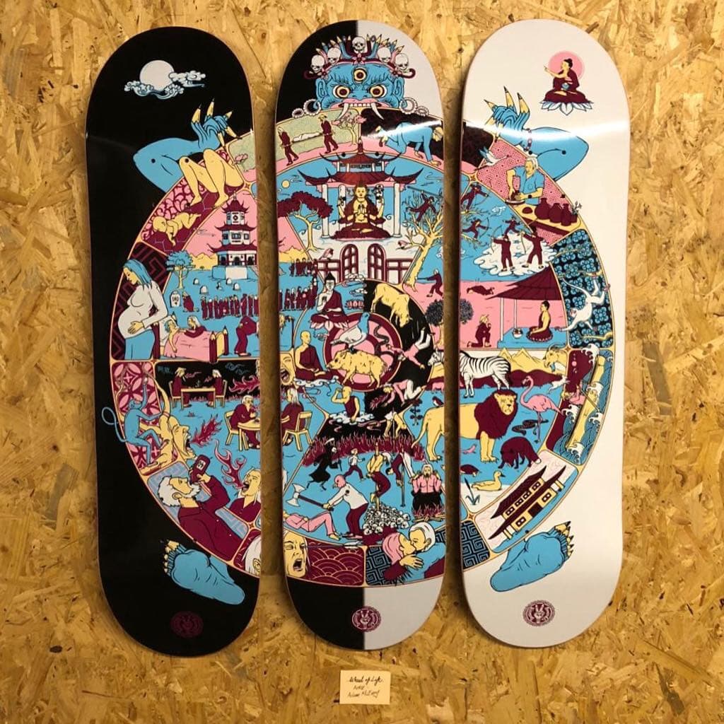 The wild boar, pigeon and snake in the hub of the wheel represent the three poisons of ignorance, attachment and aversion.
