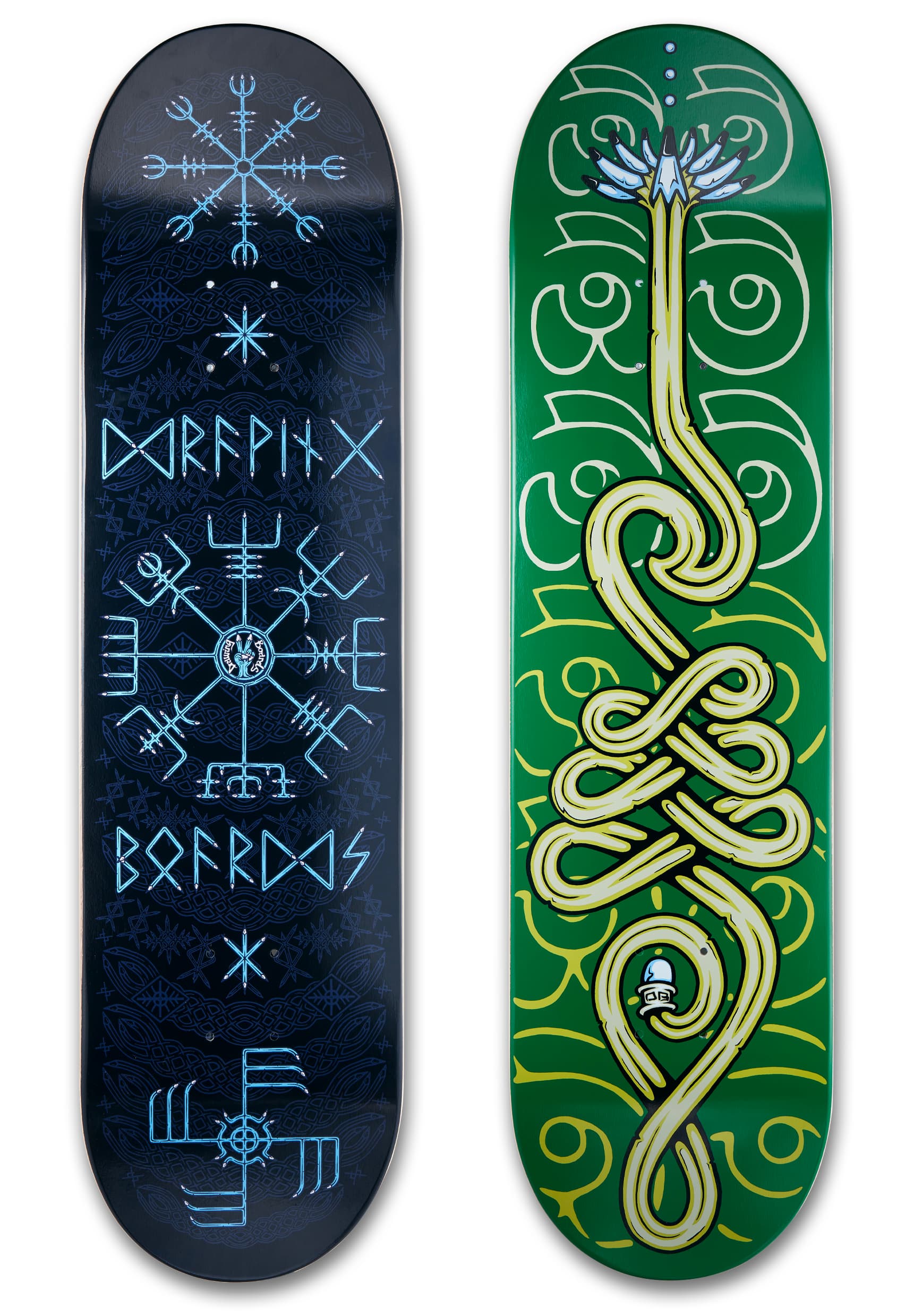 "The Helm of Awe: Is mostly still unexplained but possibly a symbol of protection as in one of the sagas Sigurd wears it before he fights the dragon. The Vegvisir Compass: The rough translation is "that which shows the way". The Ginfaxi: Used as a good luck symbol. I have also added in several runes for the stars, trees, protection and Odin's eye."