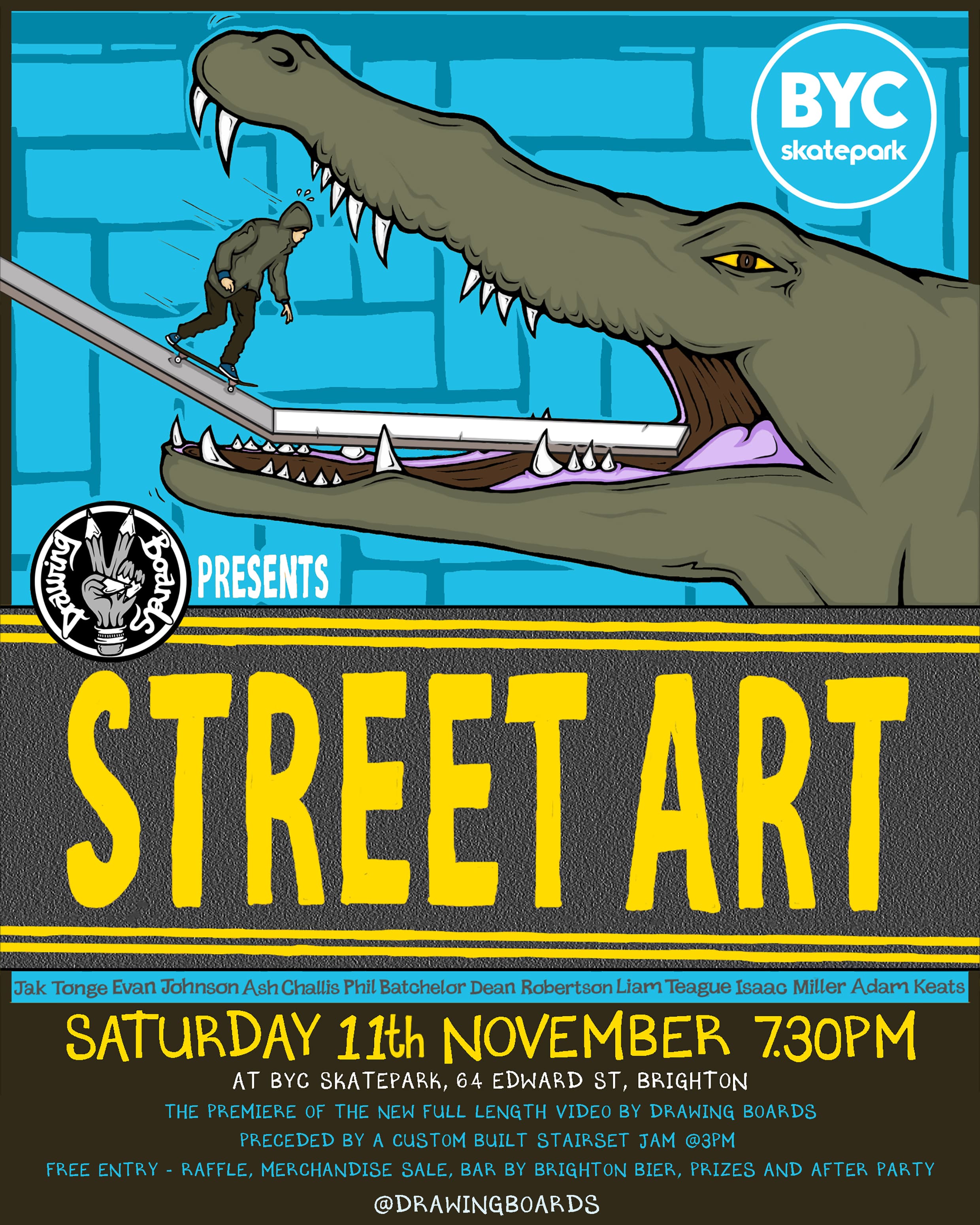 Stoked to announce we will be premiering “Street Art” at @bycskatepark on Saturday 11th of November. The show starts at 7:30pm, and will be proceded by a big stair jam held by BYC starting at 3pm. Expect prizes, a bar by @brightonbierbrewery, a raffle, merch sale and after party. Cancel all other plans and come on down.